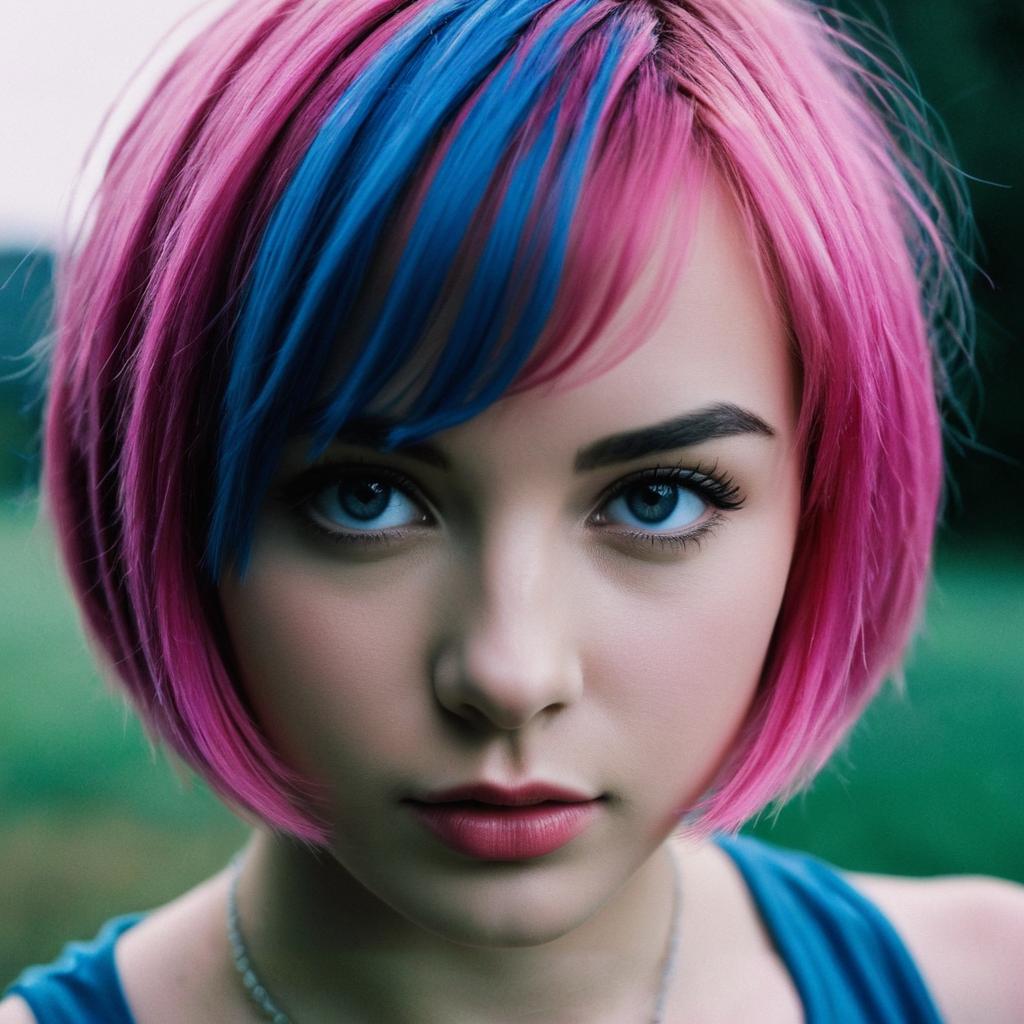 Scott pilgrim ramona flowers,1girl, solo, pink hair, short hair, looking at viewer, realistic, blurry, blurry background, blue eyes, portrait, closed mouth