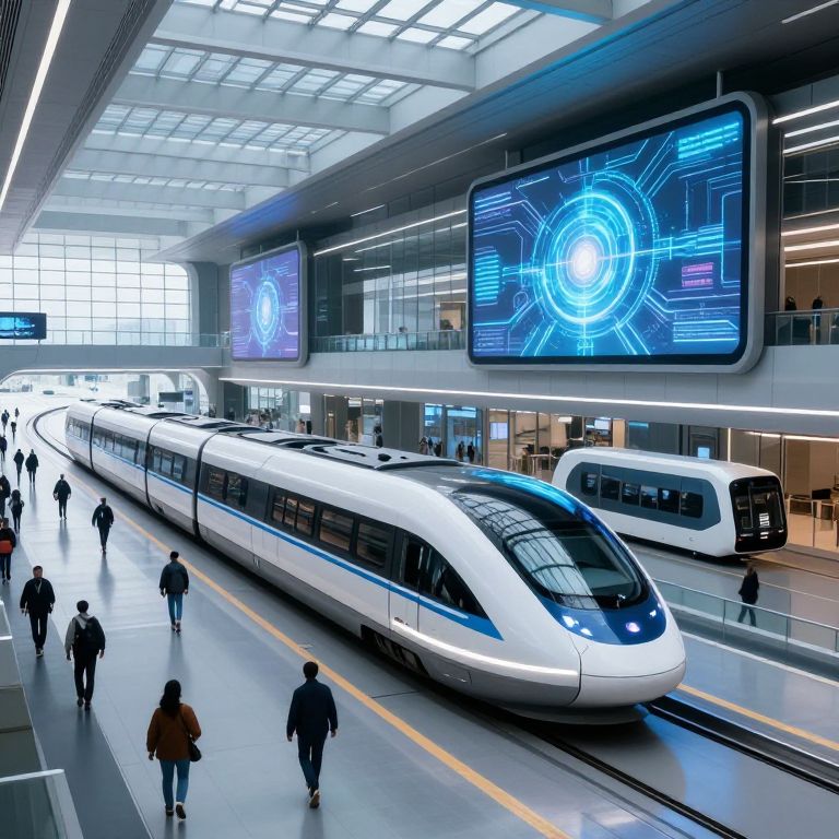 Modern train station photograph: sleek white high-speed train, futuristic blue digital screens, people walking, glass ceiling, bright lights, clean, contemporary design.