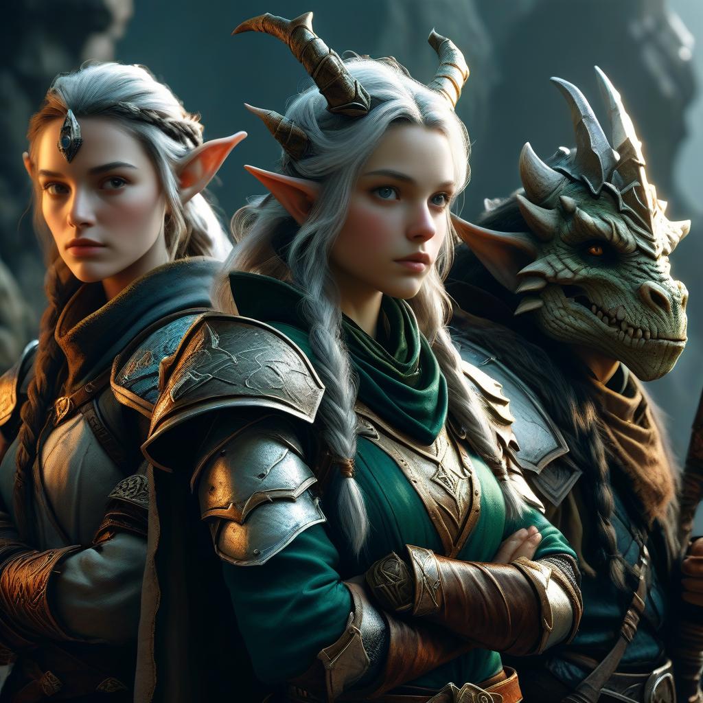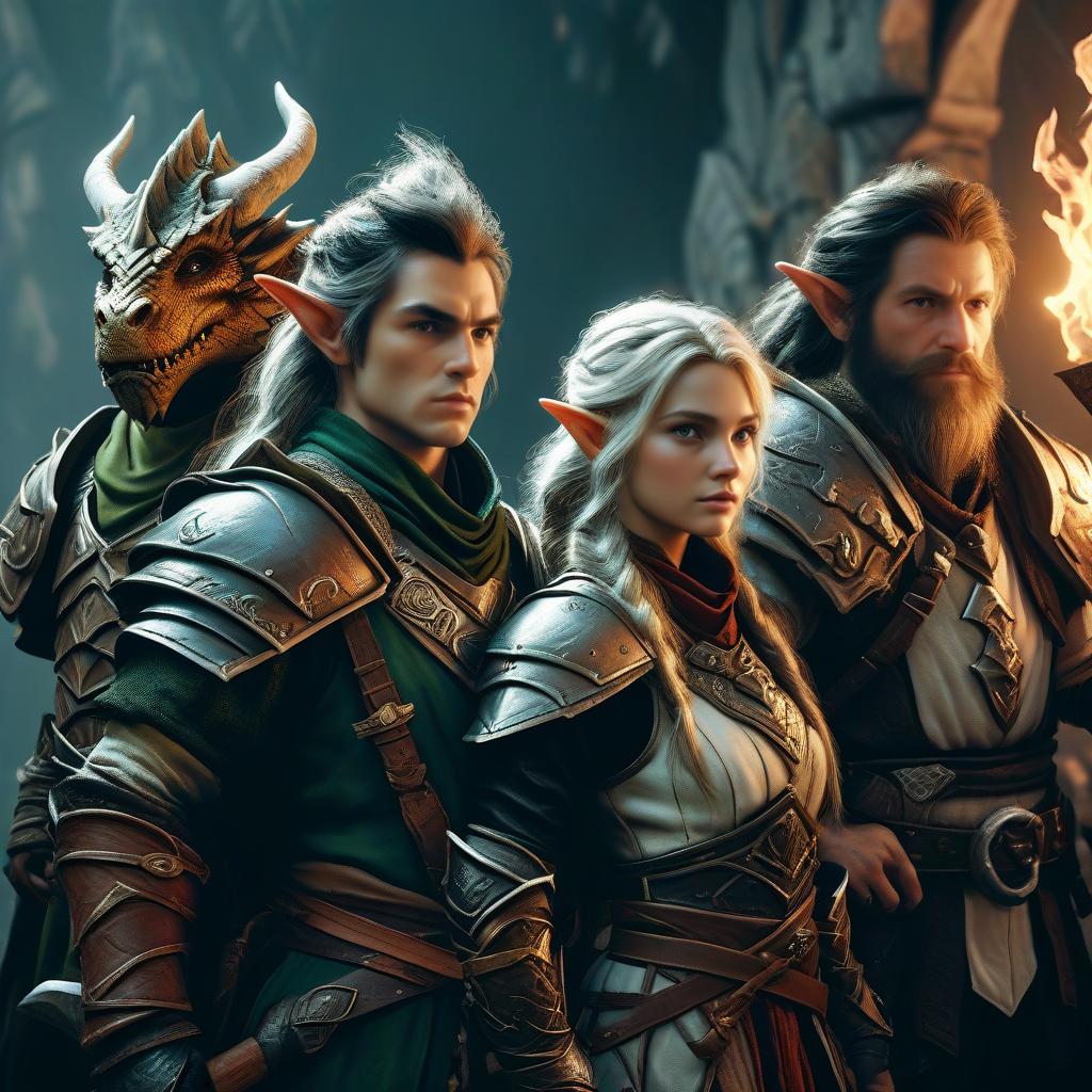 Portrait of a group of heroes: female dragonborn fighter, male elf bard, female human cleric, male gnome rogue, cinematic lighting, full shot, grainy film look, 35mm movie camera style, photorealistic