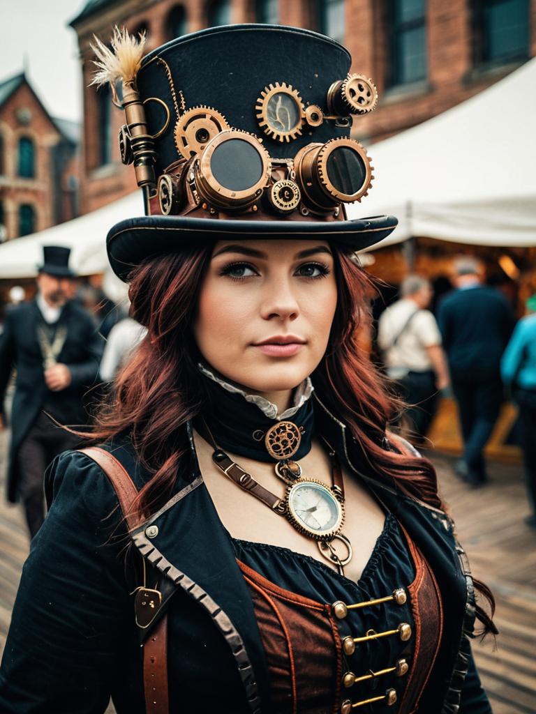 Woman in Steampunk Lady Costume, cosplay festival portrait, photorealistic realism