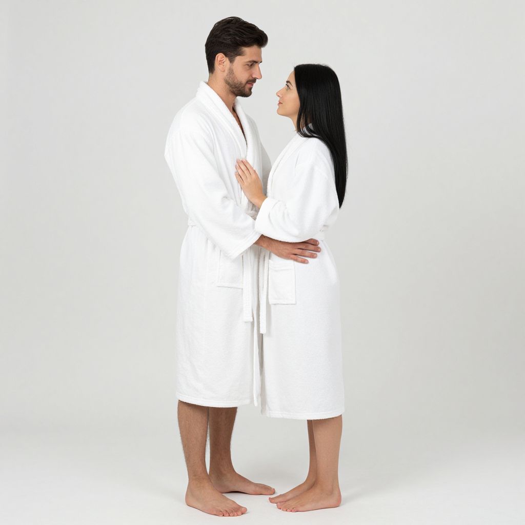 Photograph of a man and woman standing closely together against a white background. Both are wearing white bathrobes, with the man's hand gently resting on the woman's waist and the woman's hand on his chest. The man has short, dark hair and a beard, while the woman has long, straight black hair. They are barefoot, and their expressions are soft and affectionate. The image is brightly lit, emphasizing the white bathrobes and creating a clean, minimalist feel. The man is on the left, and the woman is on the right.