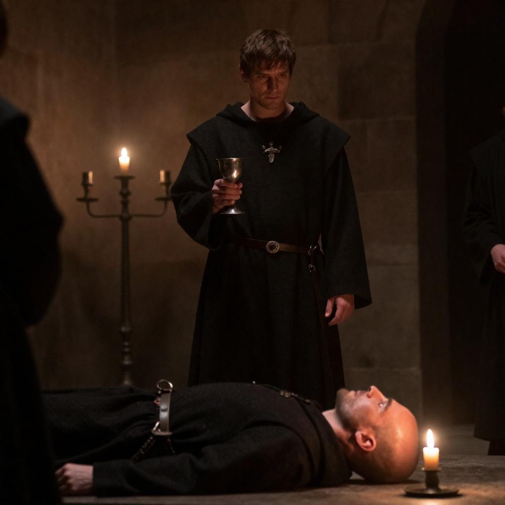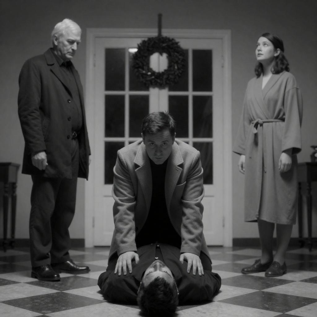 Photograph of a dimly lit, wooden-floored room with three men. One man kneels beside a fallen man lying on the floor, both dressed in dark clothing. Two other men stand in the background, also in dark attire. The room has tall, shadowy columns and a balcony. The lighting creates dramatic shadows, emphasizing the somber mood.