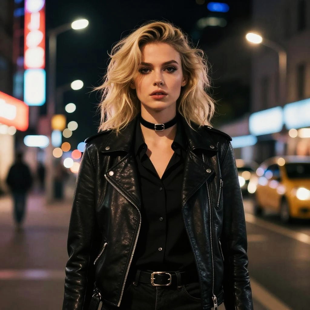 Photograph of a blonde woman with wavy hair, wearing a black leather jacket and choker, standing on a neon-lit city street at night