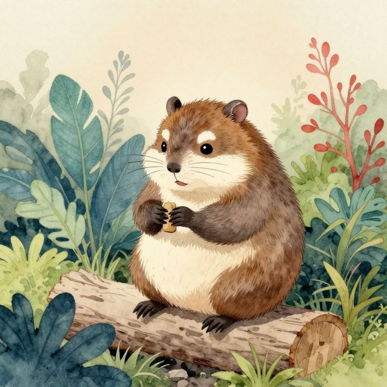 Watercolor illustration of a chubby brown and white chipmunk sitting on a log, nibbling a small acorn, surrounded by lush green foliage and