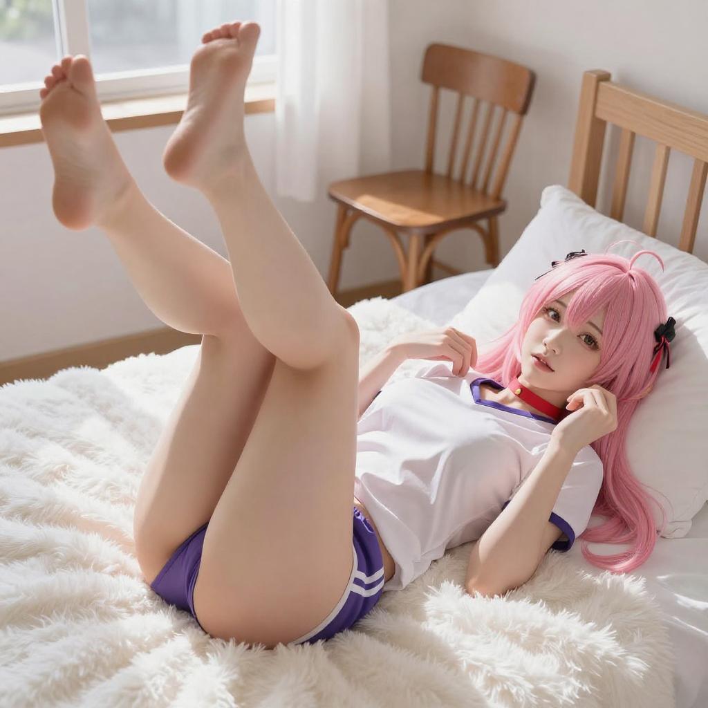 Digital artwork of a pink-haired anime girl with fair skin, lying on a fluffy white bed. She wears a white shirt, purple-striped shorts, and a red choker. Her legs are raised, revealing her bare buttocks. She touches her face with one hand, and a wooden chair is in the background. Bright sunlight streams through a window.