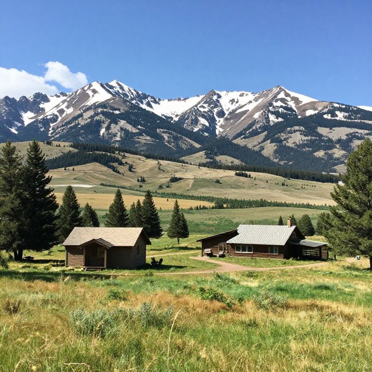 Two rustic wooden cabins situated in a green meadow with tall pine trees, set against a backdrop of snow-capped mountains under a clear blue sky. The landscape combines grassy fields and forested hills, showcasing a serene mountain rural setting.