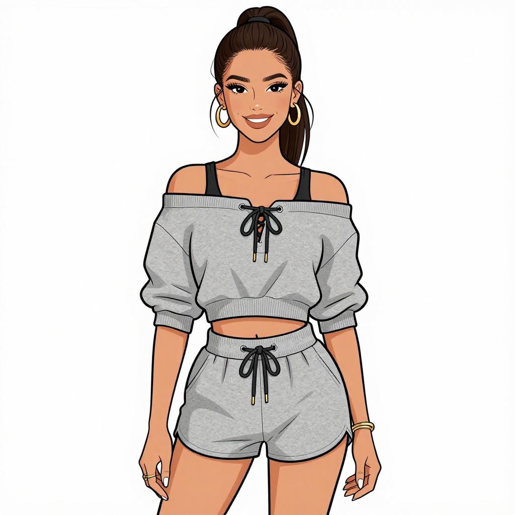 Digital illustration of a young woman with light brown skin and dark brown hair in a high ponytail. She wears large hoop earrings, an off-the-shoulder grey sweater with puffed sleeves, and matching grey shorts with a drawstring. A black strap of a bra is visible under the sweater. She has a confident smile, light makeup, and is standing against a plain white background. Her right hand rests on her hip, and she wears a gold bracelet on her left wrist. The style is vibrant and cartoon-like with bold lines and flat colors.