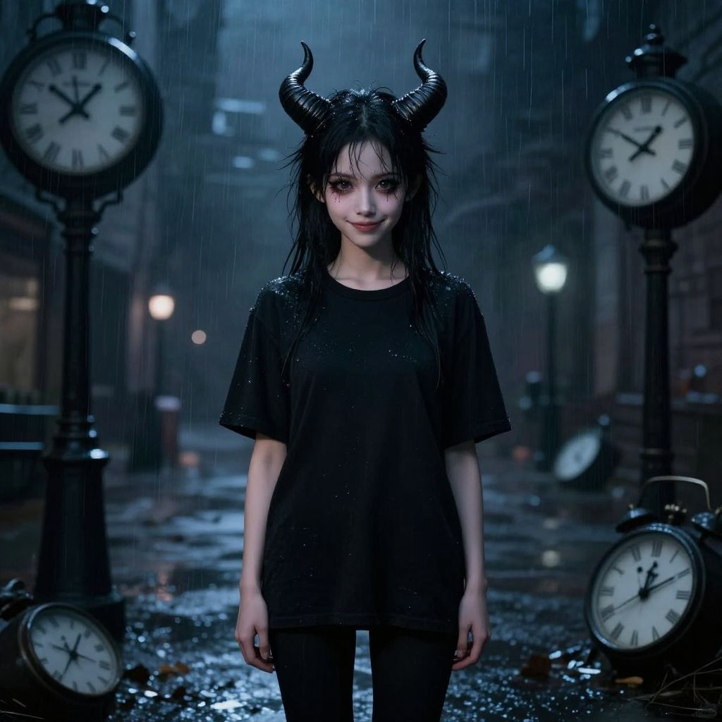 Masterpiece, (10:00 pm), dark rainy night, eerie glow, sodium lights, Rembrandt lighting, photorealistic, sharp focus, from a standing position, 1girl, 26-year-old succubus, (cute: 1.5) (petite: 1.3), black hair, (bushy ponytail: 1.3), (small horns: 1.3), (tiny body: 1.5) (160cm height: 1.5) (small breasts: 1.5) With Thick Eyelashes, small mouth, (realistic skin texture: 1.3), dark hazel eyes, (extremely delicate: 1.3), in a bleak urban landscape of (broken clocks: 1.3), wearing a (boxy black t-shirt) and (leggings), (amused smile)