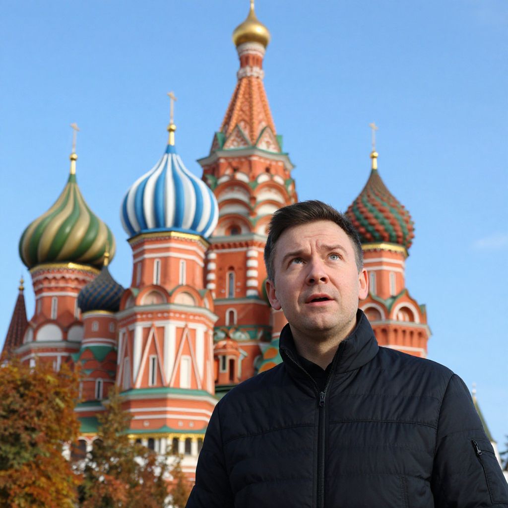 Photograph of a man with short dark hair, wearing a black jacket, standing in front of the colorful Kremlin towers in Moscow. He has a slightly surprised expression and is looking upwards. The towers are red with white trim and feature blue, green, and gold onion-shaped domes. The sky is clear and blue, and there are autumn-colored leaves in the lower left corner.