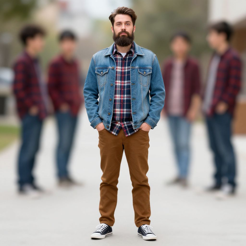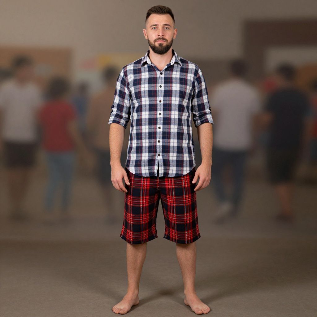 Plaid shorts costume, 1boy, male focus, facial hair, beard, shirt, solo, full body, shorts, standing, plaid shirt, short hair, blurry, plaid, looking at viewer, blurry background