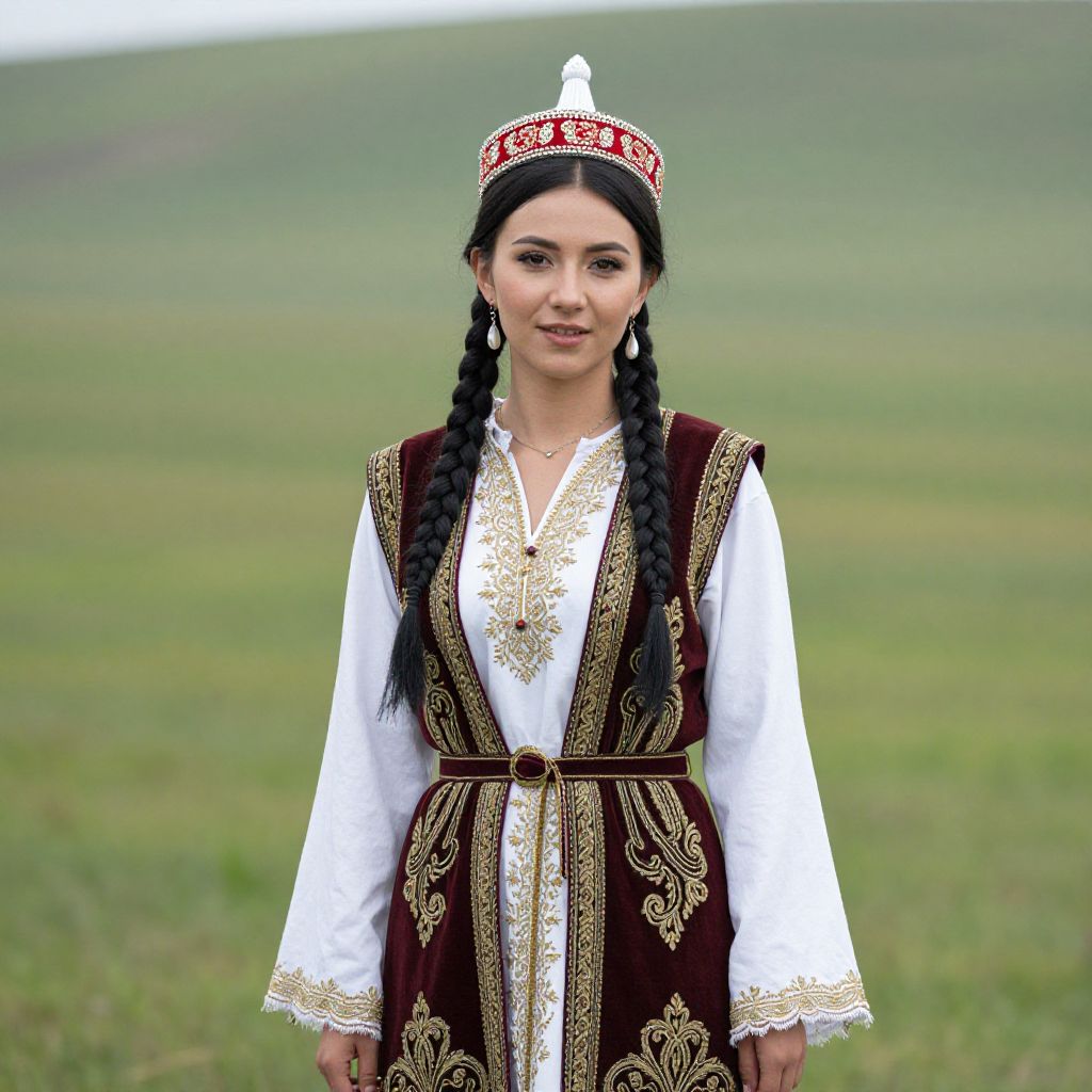 "Traditional Georgian Dress, woman in a traditional dress with braids and a hat"