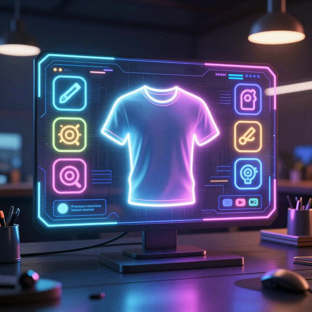 Neon-lit computer monitor displaying a glowing, neon blue and pink virtual t-shirt with colorful interface icons in a dimly-lit workspace.