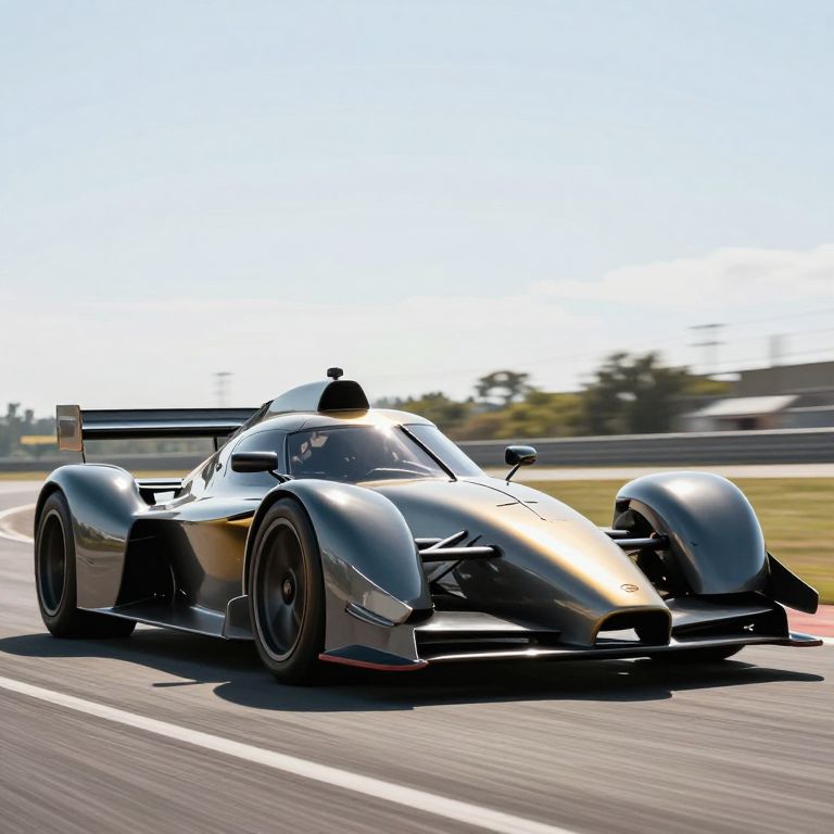 Photorealistic digital artwork of a sleek, black and gold racing car with a low, aerodynamic design and large rear wing, speeding on a racetrack. The car has a glossy finish, with black wheels and red accents. The background shows a blurred, sunny racetrack with green grass and distant structures. The car's nose is pointed forward, and its headlights are prominent. The road has white lane markings, and the overall scene conveys high speed and motion.