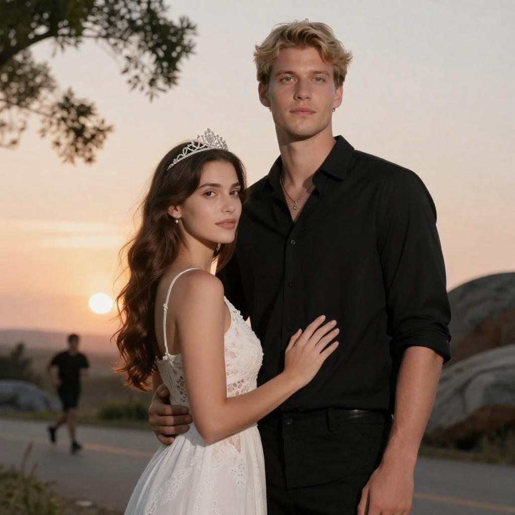 Portrait of a tall blond man in a black shirt standing closely beside a woman with long wavy brown hair dressed in a white lace dress and silver tiara. The woman rests her hand on the man's waist while they both look ahead with neutral expressions. The background features a warm sunset sky, green tree branches, rocky landscape, and a distant runner on a road.