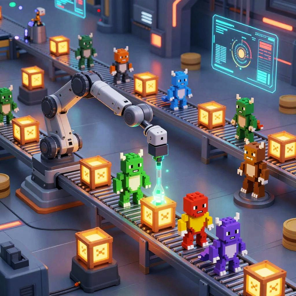 Sprite generation concept visualized as an automated robotic assembly line producing pixel art heroes and monsters, glowing crates and conveyor belts, futuristic factory interior with holographic interfaces, high-tech and imaginative style, vibrant color palette