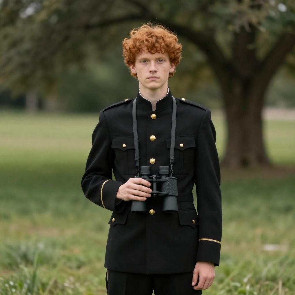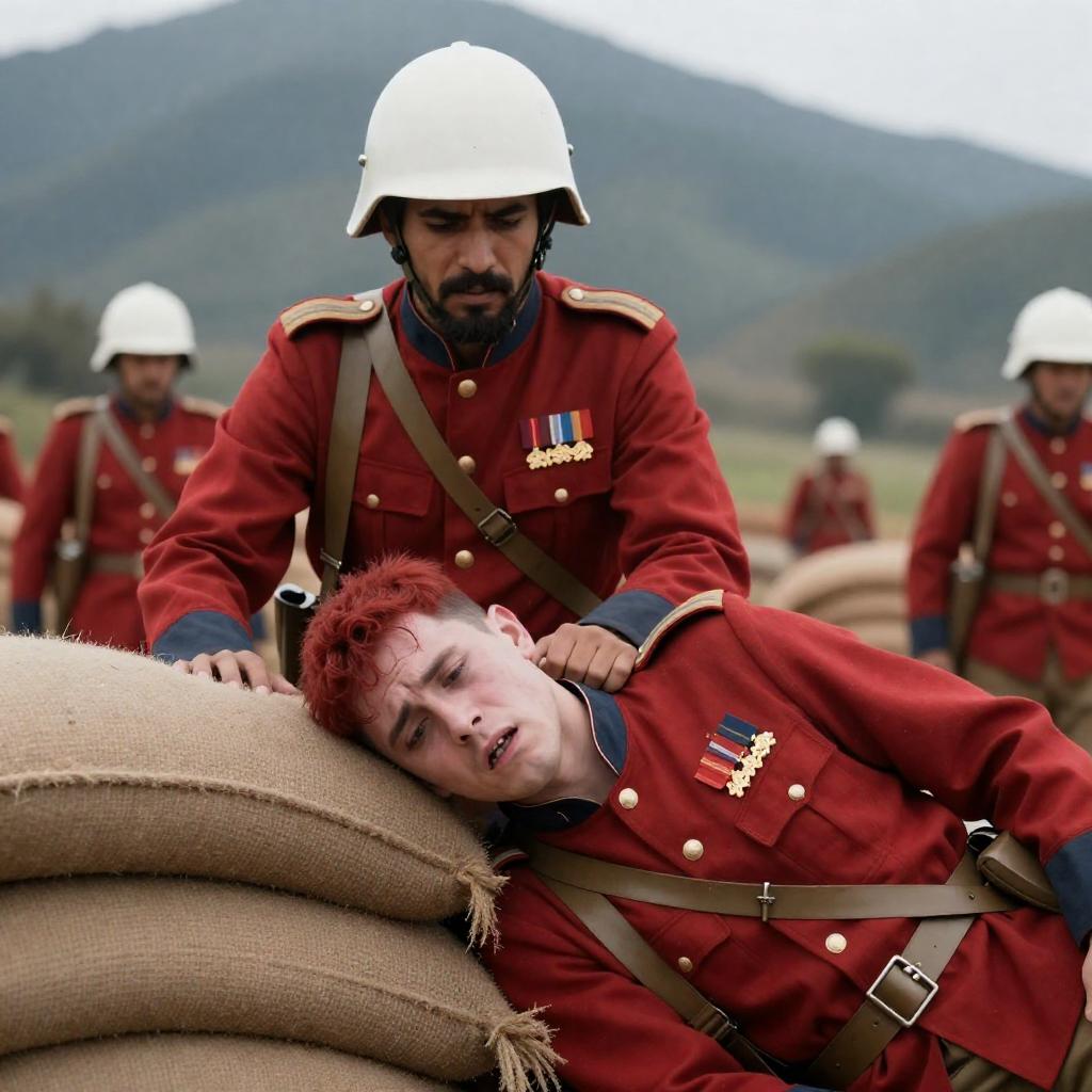 Photograph of two men in red military uniforms with gold epaulettes. The man in front, with dark hair, lies back with binoculars, looking up. The blond man, leaning over him, has a focused expression. Mountains and ruins in the background. The blond man's hand rests on the other's shoulder. Both wear belts and have loose, unkempt hair. Bright daylight.