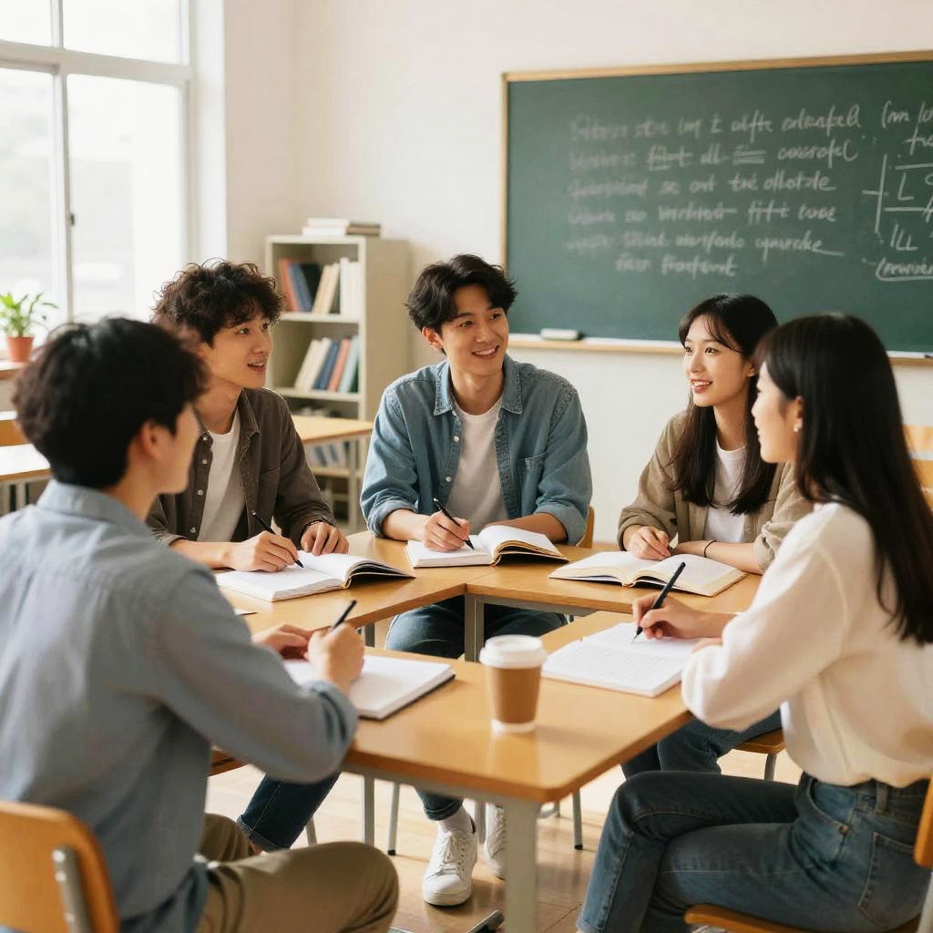 A group of young adults having a lively discussion in a bright classroom with natural lighting, casual modern clothing, books and notebooks on desks, a chalkboard with writing in the background, warm and friendly atmosphere