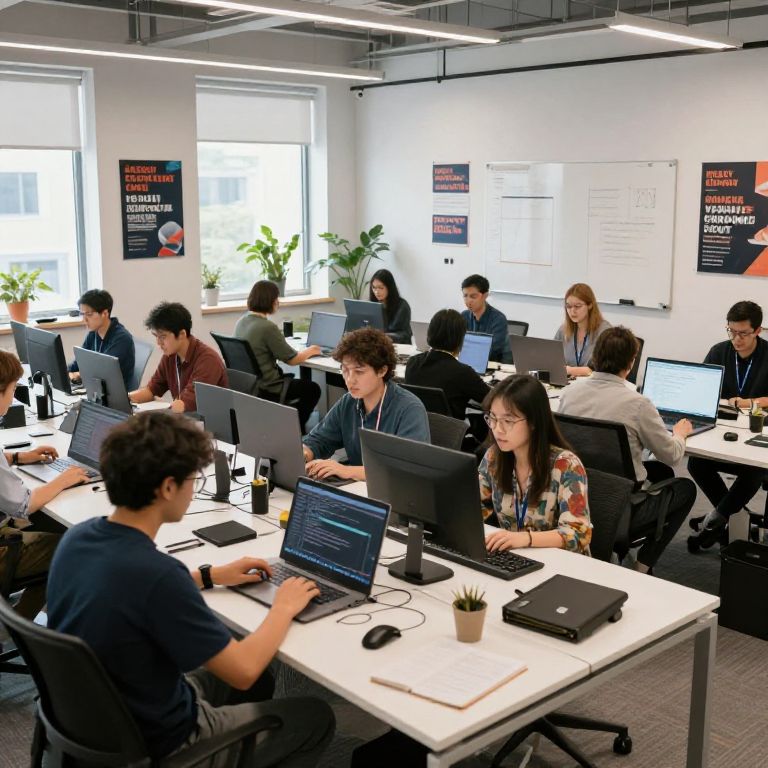 A panoramic view of a tech startup office with rows of employees coding on their laptops, surrounded by modern furniture, whiteboards, and motivational posters, with natural light and a vibrant, collaborative atmosphere.