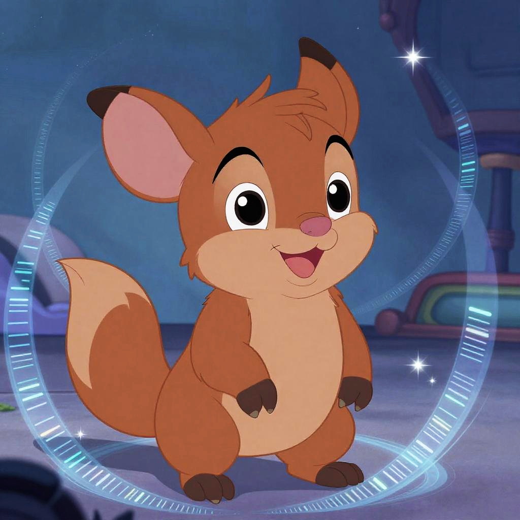 An imaginative Disney AI character design featuring a charming robotic companion inspired by classic Disney critters, rendered in vivid colors with expressive features and surrounded by swirling data streams and sparkling fairy dust in a high-tech fantasy setting.