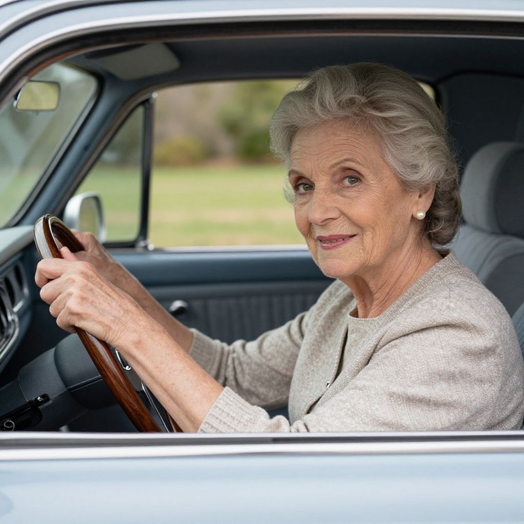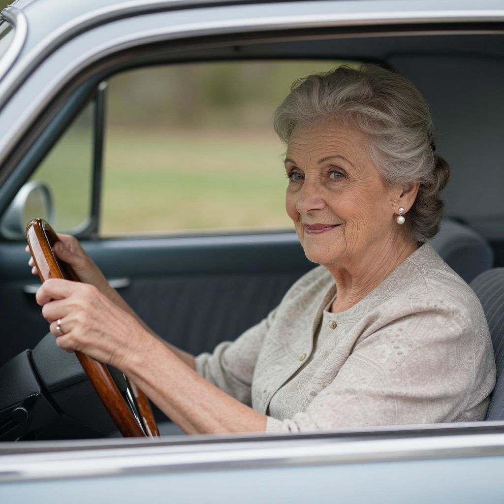 Photograph of an elderly white woman with gray, elegantly styled hair, wearing a cream-colored, textured blazer and pearl earrings, sitting in the driver's seat of a silver car. She holds the wooden steering wheel with both hands, smiling gently. The car's interior is dark with a textured upholstery. The background is softly blurred, showing green grass and a hint of a fence. The woman's expression is calm and composed, suggesting a sense of grace and experience. The lighting is natural, highlighting her gentle features and the subtle textures of her clothing.