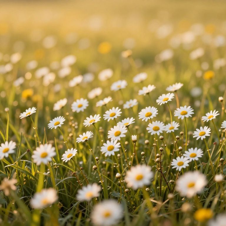 Golden hour sunlight bathes a vibrant meadow of daisy-like flowers, their petals aglow with a luminous sheen, evoking a serene yet enigmatic atmosphere where ancient whispers seem to resonate through the air.