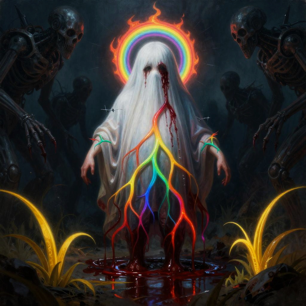Digital artwork of a ghostly figure with a rainbow halo, blood-stained white robes, and colorful veins, surrounded by dark creatures and glowing plants.