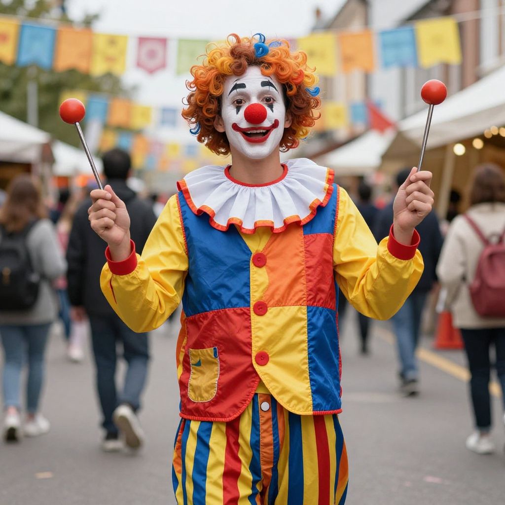 DIY clown costume male, imaginative homemade clown costume featuring a patchwork vest, ruffled collar, and striped pants, detailed clown makeup with white base and red nose, playful expression, holding juggling pins, set in a lively street festival with bright banners and crowds