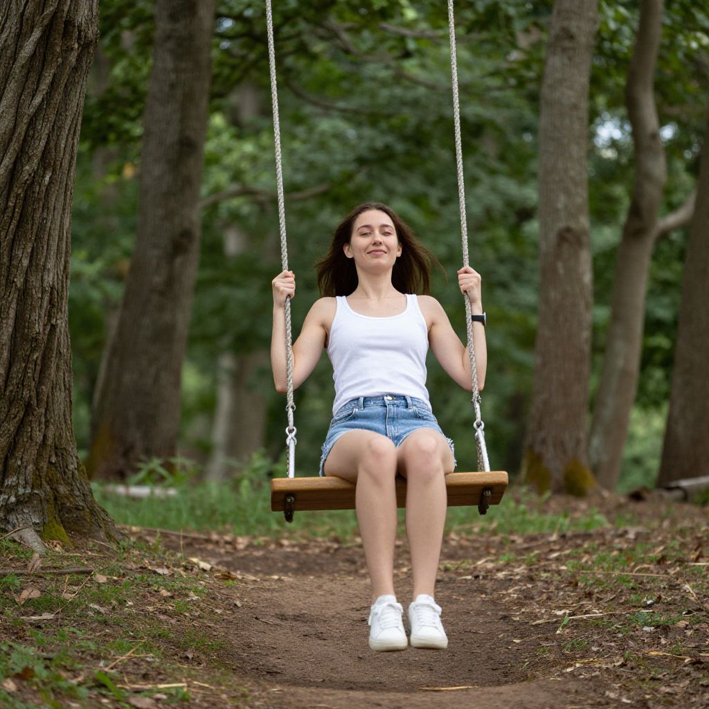 Young woman with long brown hair, white tank top, blue denim shorts, and white sneakers, sitting on a wooden swing in a lush, green forest