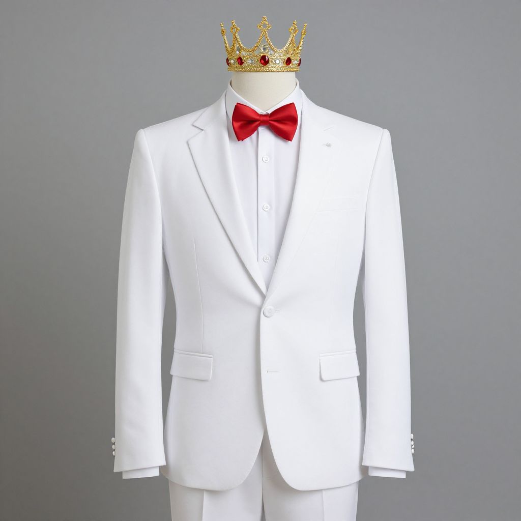 Photograph of a white suit jacket with a red bow tie, gold crown, and gray background. Regal, formal attire.