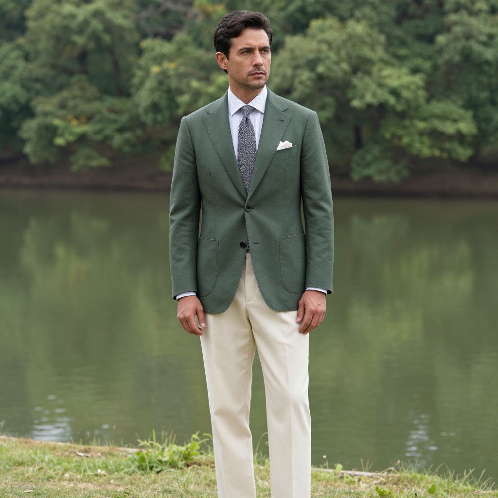 A stylish man in a tailored green blazer and cream trousers stands confidently by a serene lake, surrounded by lush trees. The natural setting enhances the sophistication of his look, making it perfect for fashion or lifestyle themes.