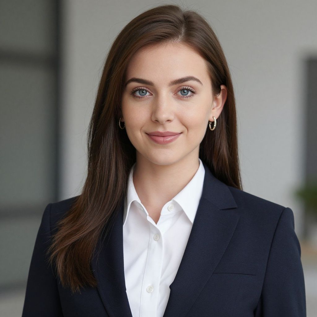 Smart business casual female, 1girl, solo, realistic, brown hair, long hair, formal, suit, looking at viewer, shirt, earrings, jewelry, smile, white shirt, lips, upper body, blue eyes