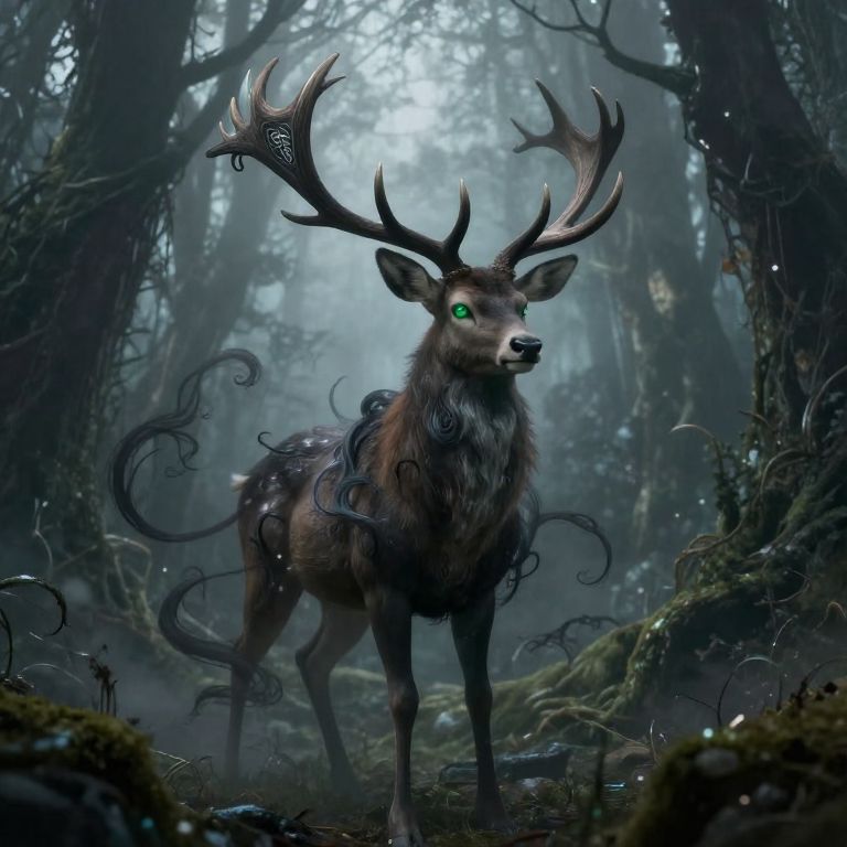 A digital fantasy artwork depicts a majestic, dark brown deer with large, intricate antlers standing in a misty, enchanted forest. The deer has glowing green eyes and ornate, black, swirling patterns on its body and antlers. The forest is dense with tall, shadowy trees and moss-covered ground, creating a mystical atmosphere. The deer stands centrally, looking directly at the viewer, with soft, diffused light filtering through the fog in the background. The image blends realistic textures with fantastical elements, evoking a sense of magic and wonder.