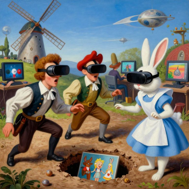 The image is a vibrant and surreal painting featuring three main characters: Don Quixote of La Mancha, Sancho Panza, and the white rabbit from Alice in Wonderland, all wearing futuristic Oculus glasses. They are gathered around a hole in the ground, appearing amazed and surprised at the digital paintings they see inside. The background is a mix of futuristic windmills and an array of strange characters engaged in creating digital art on computers. The scene is reminiscent of Hieronymus Bosch's work, with a blend of historical and futuristic elements. The colors are bold and varied, with the white rabbit's fur contrasting against the blue sky and the earthy tones of the characters' clothing. The overall composition is dynamic, with the characters and their surroundings arranged in a way that draws the viewer's eye across the painting, creating a sense of depth and movement.