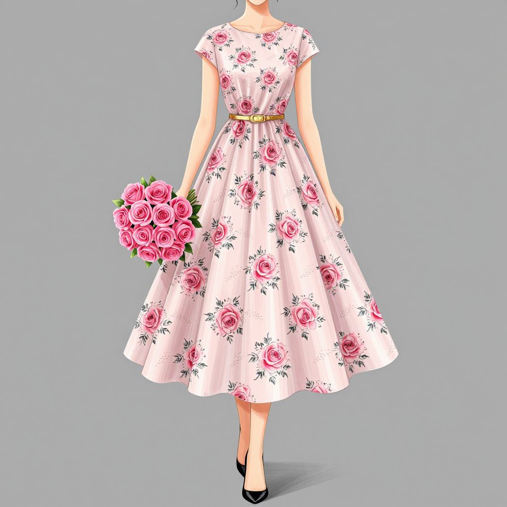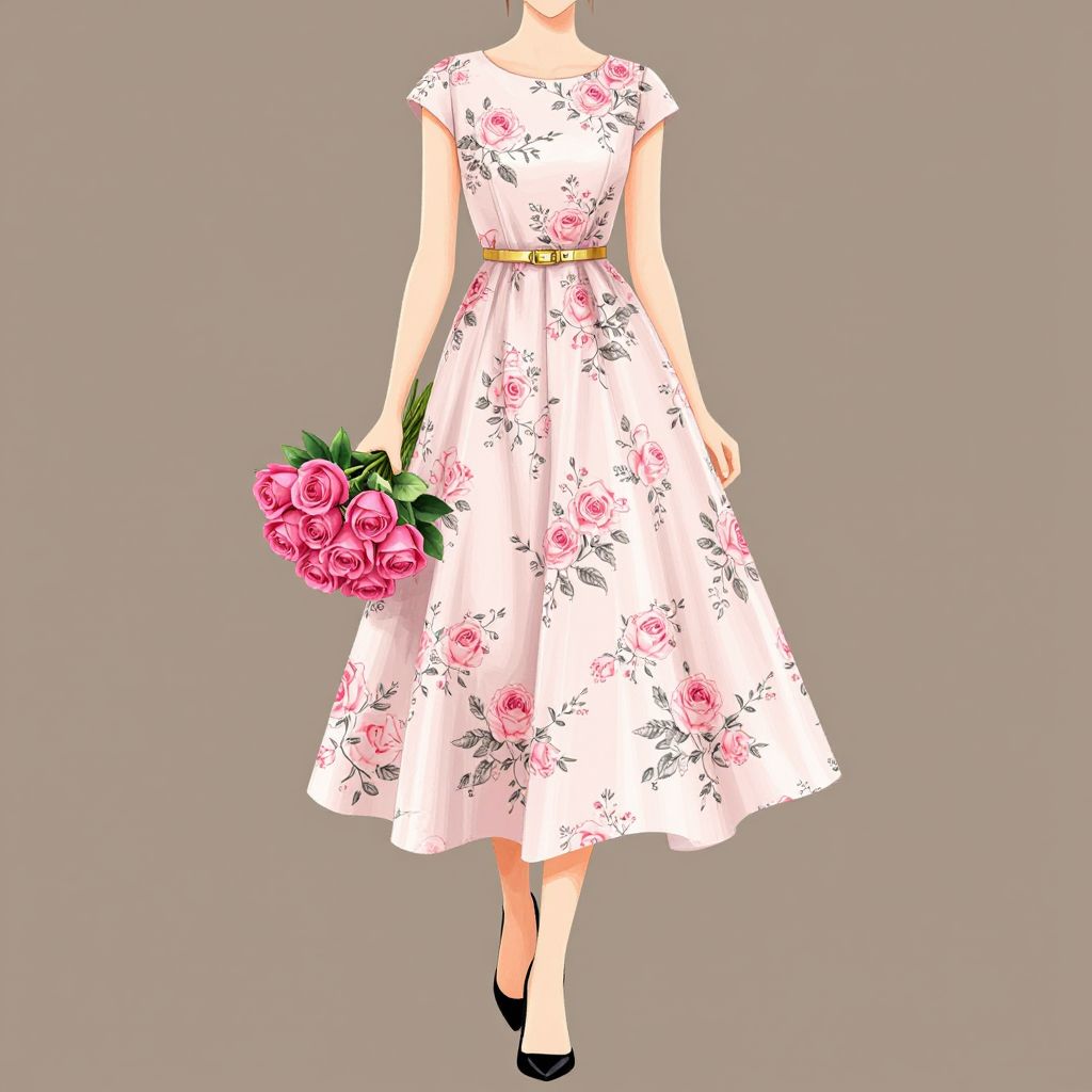 Fashion illustration showcases a woman wearing a light pink floral dress adorned with delicate rose patterns, cinched at the waist with a gold belt, complemented by black heels and holding a bouquet of vibrant pink roses in her hand.