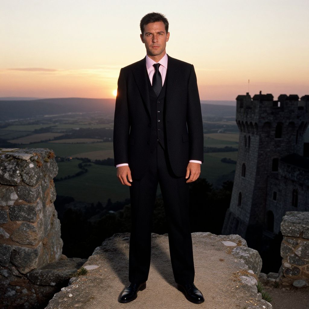 Photograph of a man standing on a stone ledge at sunset, wearing a black three-piece suit with a white shirt and pink tie. He has short dark hair and a serious expression. The background features a picturesque sunset with warm orange and pink hues, and a stone castle tower to the right. The landscape below is a mix of dark green fields and distant trees. The stone ledge has a rough texture, contrasting with the formal attire of the man. The overall mood is dramatic and regal.