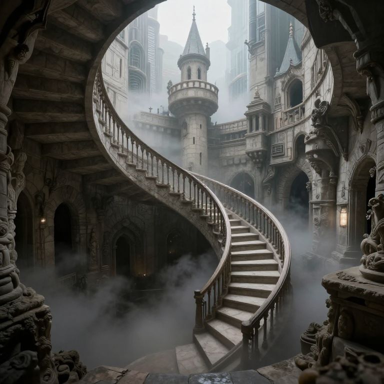 An ethereal spiral staircase winds through a labyrinthine pocket dimension, its stone steps whispering secrets of infinite worlds—medieval castles and cyberpunk cities alike dissolve into the mist, leaving behind a profound sense of wonder and existential mystery.
