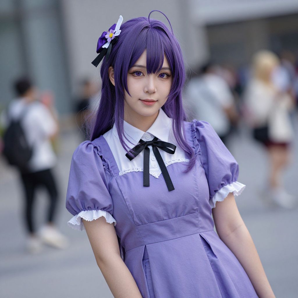 Photograph of an Asian woman in a purple anime-style dress with white frills, black ribbon, and purple hair, standing in a blurred urban setting