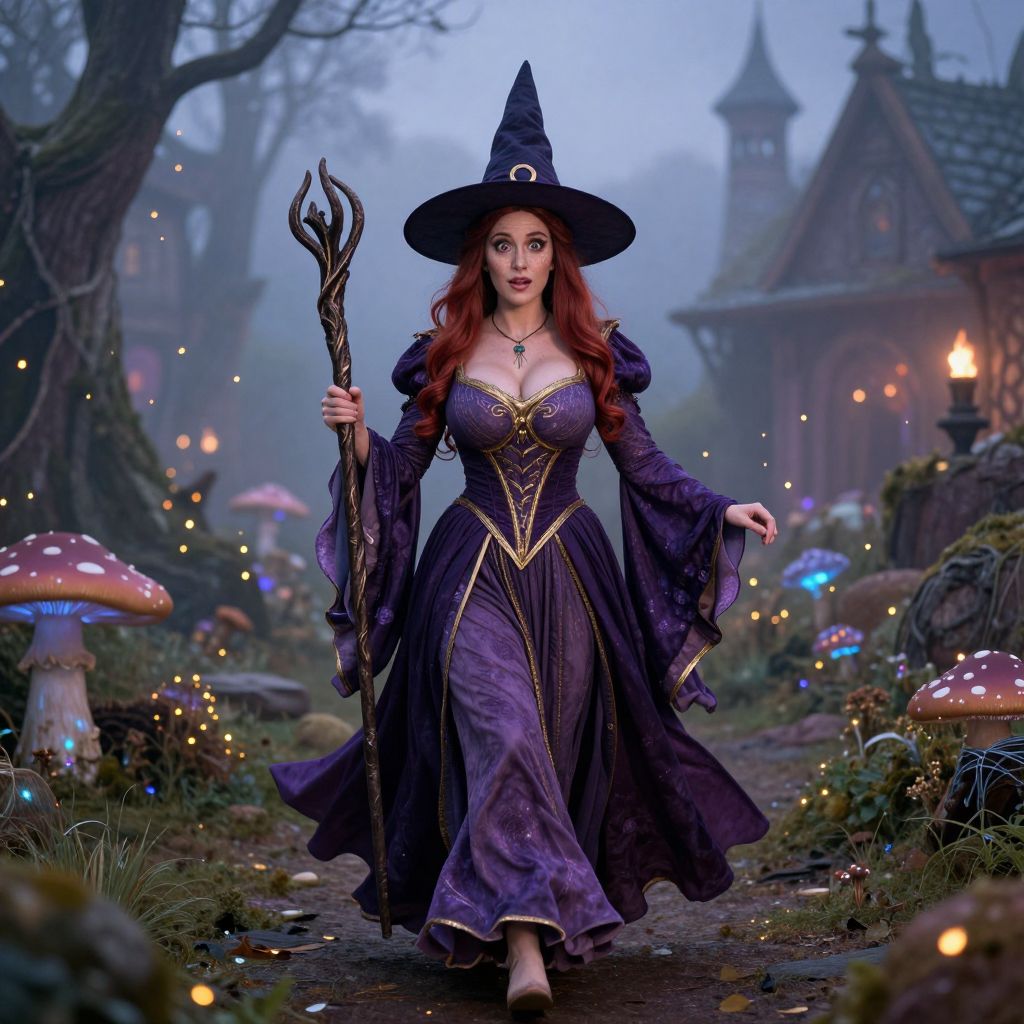 A woman in a dynamic Narnia witch costume is walking through a foggy, enchanted village at twilight, the atmosphere glowing with bioluminescent mushrooms and fireflies, she wears a flowing purple and gold gown with a long witch's staff, her face has a doll-like expression with wide, curious eyes and fair skin, freckles across her nose. The woman has big tits and cute face