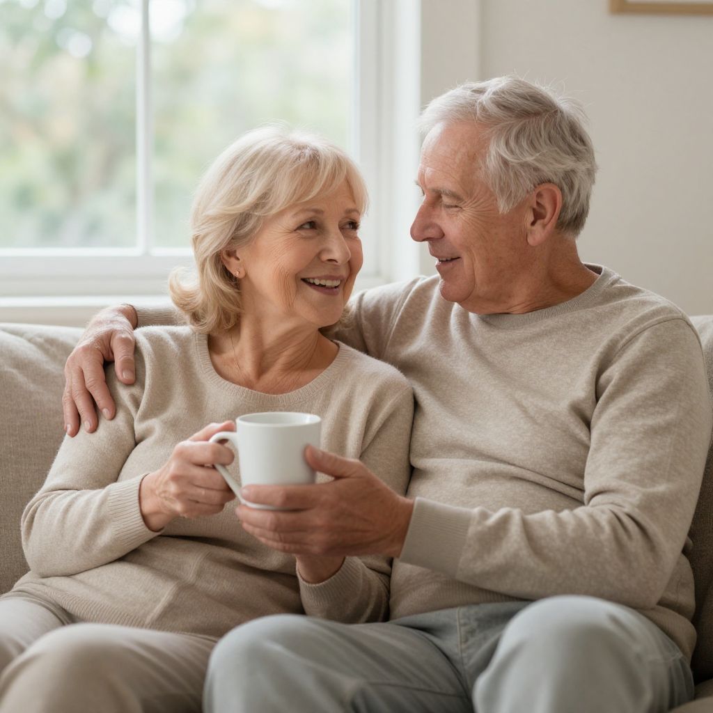 Senior couple relaxing together on a cozy couch, sharing a warm moment with a white mug held by the woman, while the man's arm affectionately rests around her shoulders, set against a backdrop of soft natural light streaming through a window with blurred greenery outside.