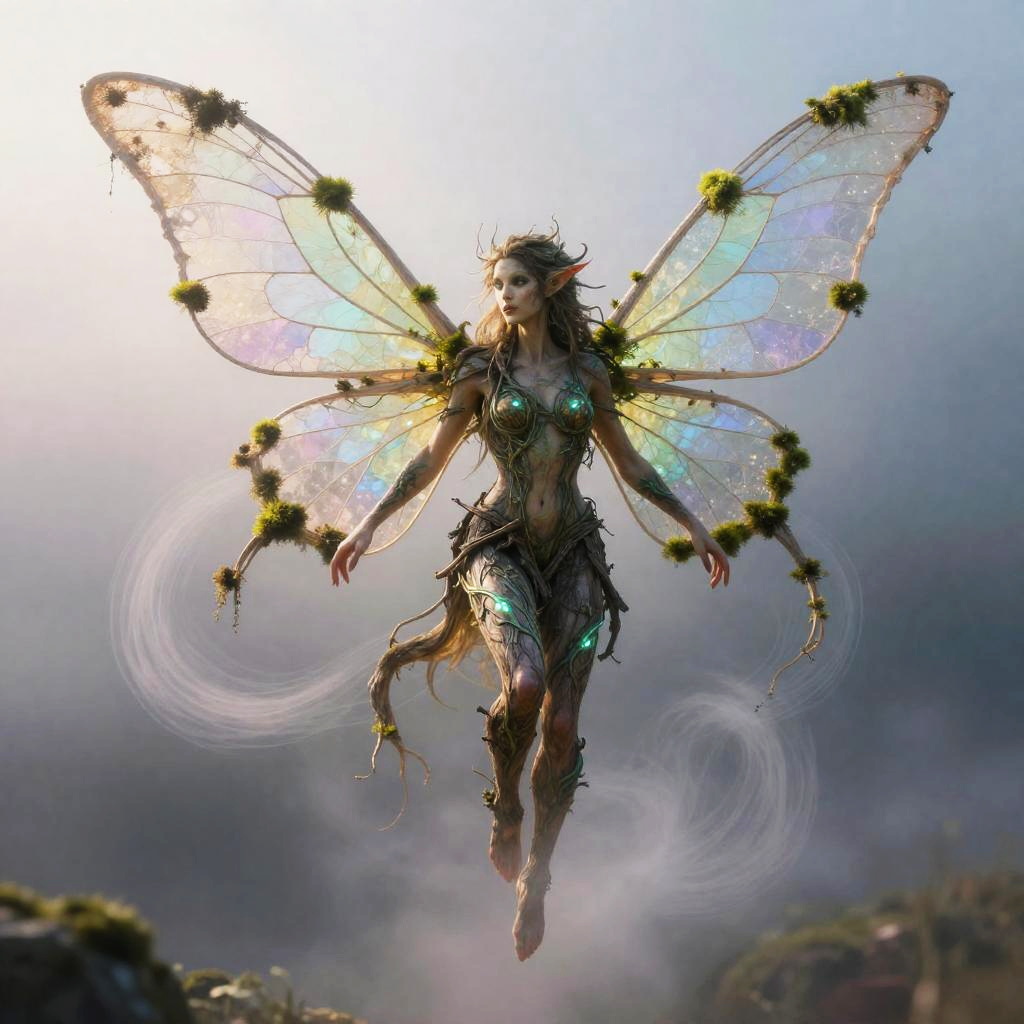 A ancient dryad with bark-textured skin and bioluminescent vine tattoos hovers gracefully amidst a whirlwind of stained-glass gossamer wings veined with living moss and tiny glowing spores, shimmering softly in pastel hues. Sunlight dances across her form, casting a mesmerizing play of shadows, as delicate strands of mist curl around her, set against a radiant, gradient-hued backdrop, evoking the enchanting style of Kay Nielsen.