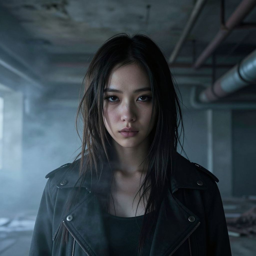 The image is a high-resolution photograph featuring a young woman KTNK in a gritty, industrial setting, She stands in a dimly lit, abandoned or possibly post-apocalyptic environment with exposed pipes and a rough, concrete ceiling, The scene is shrouded in a thick, bluish mist that adds to the eerie atmosphere, close-up face