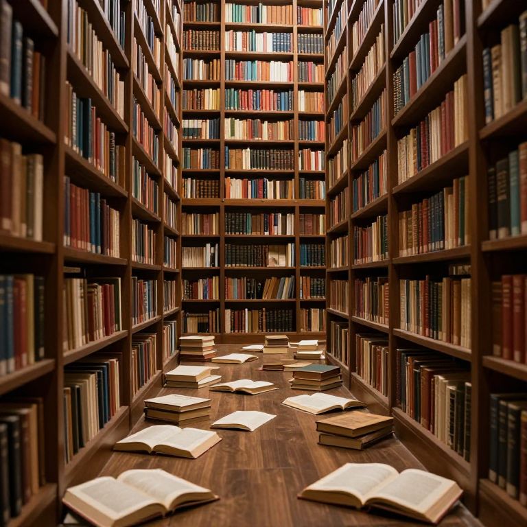 Photograph of a dimly lit, narrow library aisle with tall, wooden bookshelves on both sides, filled with colorful, bound books. The dark wooden floor is scattered with open books, their pages fanned out. The shelves are tightly packed, creating a sense of depth. The warm, brown tones of the wood contrast with the multicolored book spines. The lighting is soft, casting gentle shadows, enhancing the cozy, scholarly atmosphere. The perspective draws the eye down the aisle, suggesting a vast collection of literature.