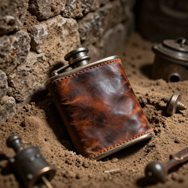 Photograph of a small, rectangular, brown leather flask with a shiny metal rim, resting on a sandy, textured surface. The leather has a rich, dark brown with orange and black marbled pattern. Surrounding the flask are several small, metallic caps, slightly out of focus, scattered across the sand. The background features a rough, rocky wall with dark, jagged stones. The lighting is dim, casting soft shadows and highlighting the flask's glossy texture. The overall scene has a rustic, treasure-hunt feel, with earthy tones and a sense of antiquity.