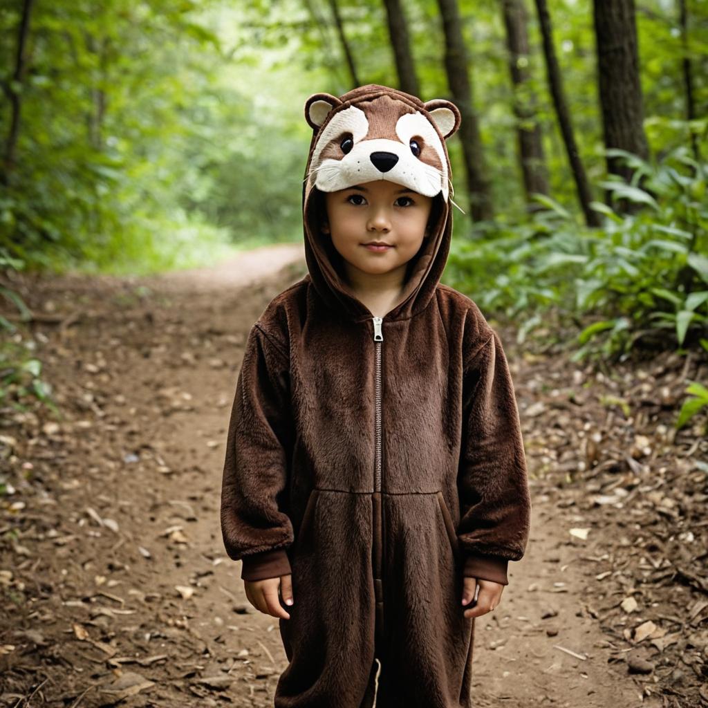 Otter toddler costume, photograph of a young boy standing in a forest, wearing a realistic brown otter onesie with a hood, otter head mask on his face, forest background, green leaves, dirt path, realistic ures, soft light, slightly serious expression, child wearing costume, detailed clothing, realistic animal costume, nature setting, daytime, slightly blurred background