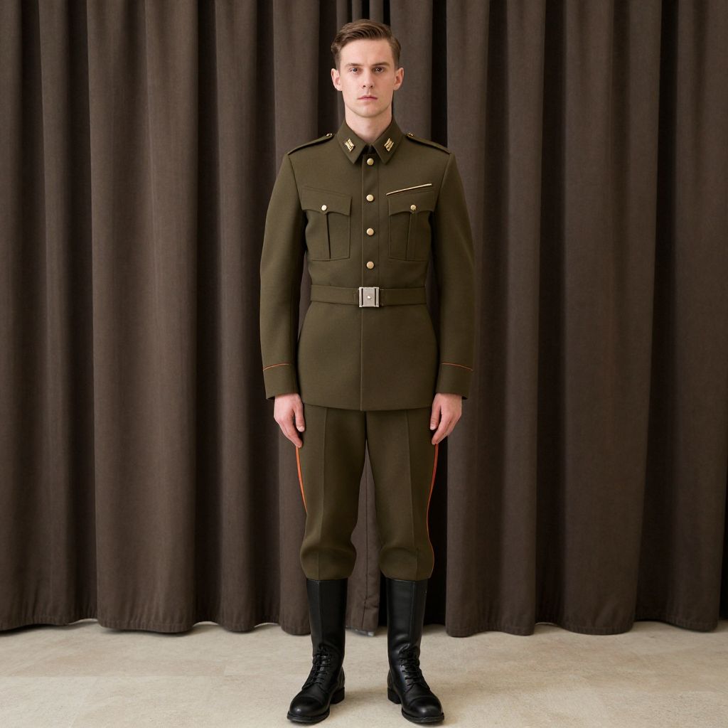 Photograph of a young Caucasian man with short, dark brown hair, standing against a dark brown curtain backdrop. He wears an olive green military uniform with silver buttons, epaulettes, and a belt with a square buckle. The uniform includes matching trousers with red stripes on the sides and black, polished leather boots. His expression is neutral, and he stands with his hands relaxed by his sides. The floor is light beige, contrasting with the darker curtain behind him. The image is well-lit, highlighting the uniform's texture and details.