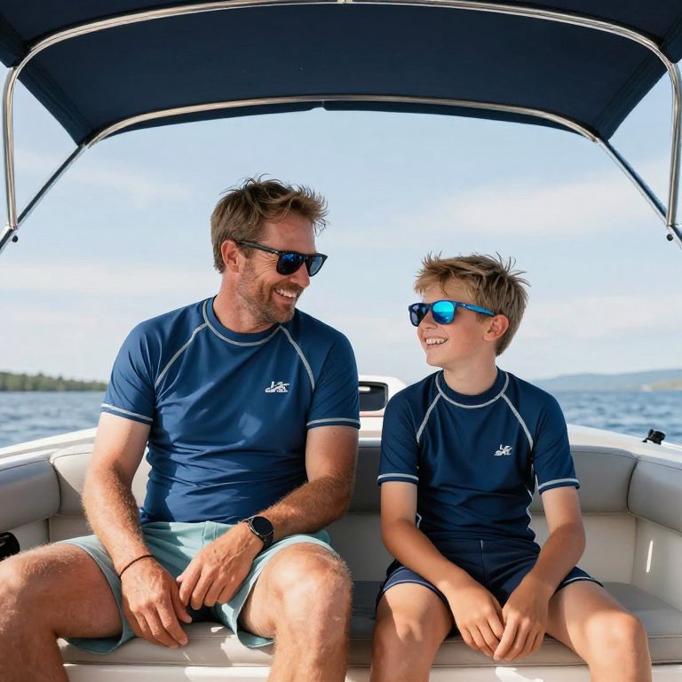 Photograph of a middle-aged man and young boy sitting together on a boat's cushioned seat. Both wear dark blue athletic shirts with white trim and matching dark blue swim trunks. The man has short, graying hair, a beard, and sunglasses, smiling at the boy. The boy, also with short blonde hair and sunglasses, smiles back. The boat's canopy is dark blue, and the background shows a bright, clear sky and calm water. The boy's shirt has a small white logo on the chest. The man wears a black wristwatch on his left wrist.