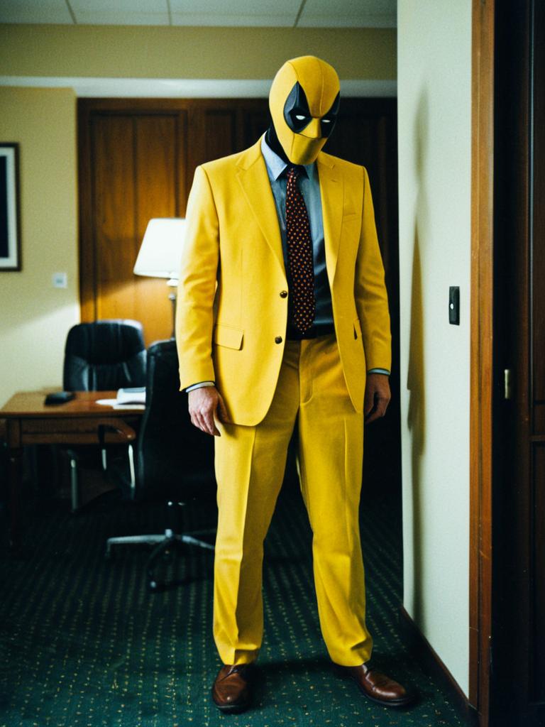 Man Yellow Suit Costume, man in a yellow suit standing in a room