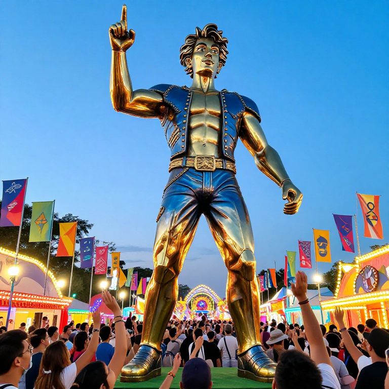 Mr beast statue towering over a vibrant festival, colorful flags and excited fans around, highly detailed metal finish reflecting bright carnival lights