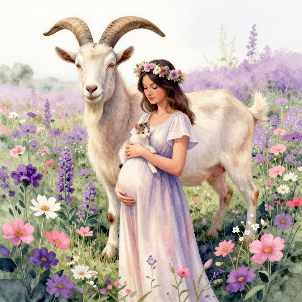 In this captivating watercolor painting, a pregnant woman stands gracefully in a vibrant flower field, her figure adorned with a delicate flower crown. She cradles a small animal, possibly a kitten, in her arms, exuding a sense of tranquility and connection with nature. Behind her, a majestic goat with large, curved horns stands tall, its presence adding a touch of wild beauty to the scene. The flowers, in shades of purple, pink, and white, create a lush, textured backdrop, their delicate petals contrasting with the smooth, flowing lines of the woman's dress. The overall composition is balanced, with the woman and goat positioned centrally, their forms aligned harmoniously with the surrounding flora. The interplay of colors and textures, from the soft, muted tones of the goat to the vivid, lively hues of the flowers, creates a serene and enchanting atmosphere.