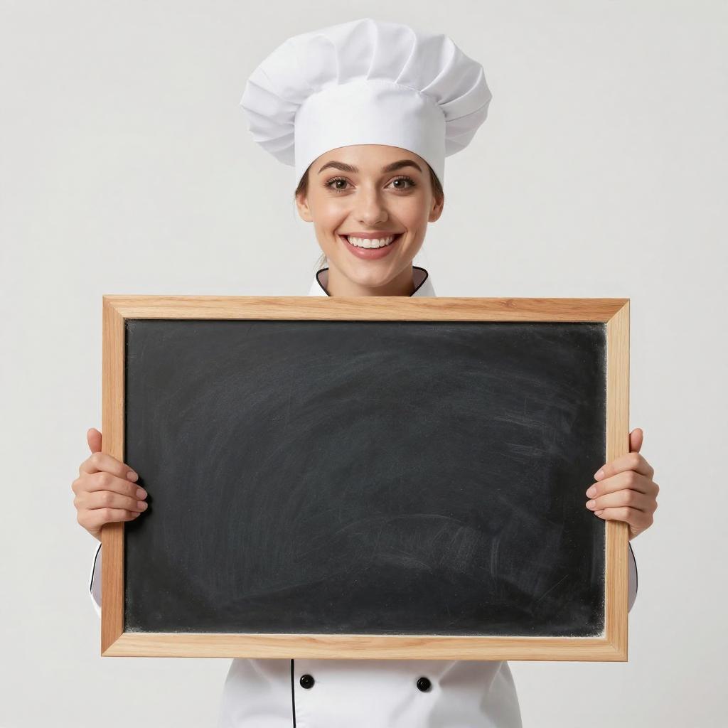Portrait of a smiling male chef with light skin and short brown hair, dressed in a white chef's hat and uniform. He is holding a blank white sign in front of his chest with both hands. The background is plain white and out of focus with even bright lighting.